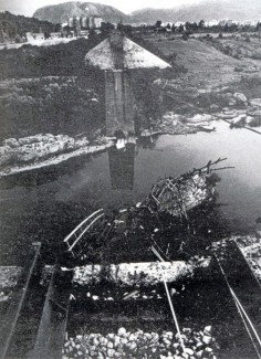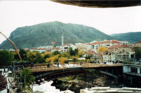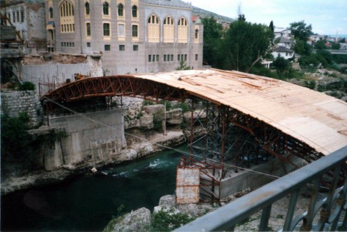 The old bridge across the Neretva River in Mostar, Herzegovina, the only bridge to survive the shelling. August 1992 Mostar, Bosnia and Herzegovina